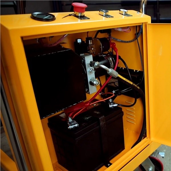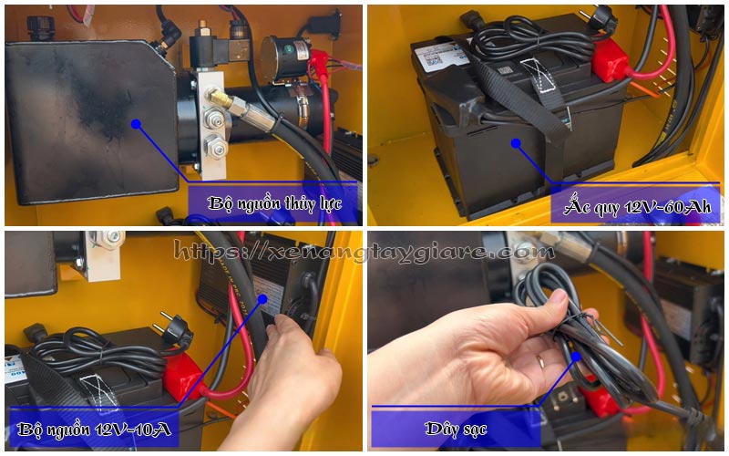 Bộ nguồn thủy lực bộ nguồn 1 chiều DC 12 với công suất động cơ lên tới 0.8 kW. Thông qua cơ chế điều khiển: Khi ấn nút nâng, bộ nguồn sẽ đẩy dầu thủy lực áp lực cao vào xi lanh đẩy Piston của xi lanh đi ra, giúp nâng hàng hóa lên cao. Khi ấn nút hạ bộ nguồn sẽ mở thông đường dầu hồi từ khoang xi lanh với thùng dầu (Trong bộ nguồn), lúc này piston sẽ tụt xuống, hạ mặt bàn. Đặc biệt, trong bộ nguồn còn được trang bị thêm các van như: