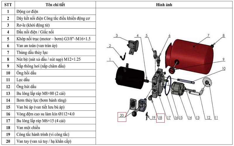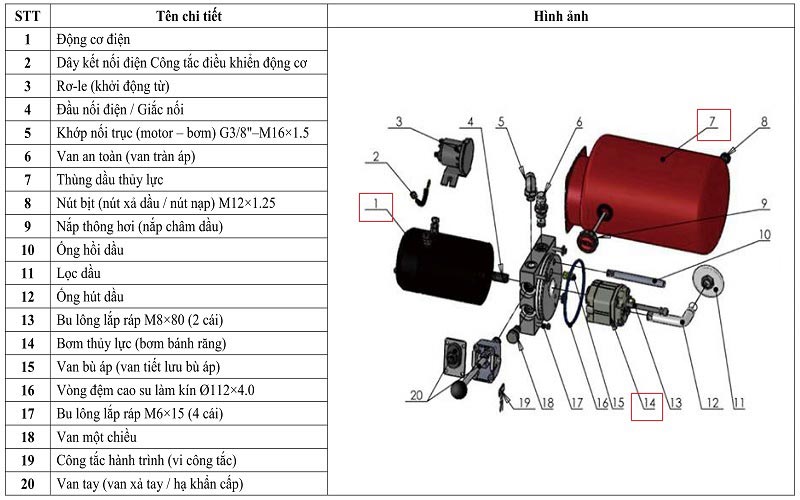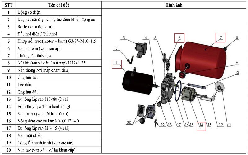* Lưu ý: Thùng dầu, bơm bánh răng, van an toàn, motor điện nằm trong bộ nguồn thủy lực